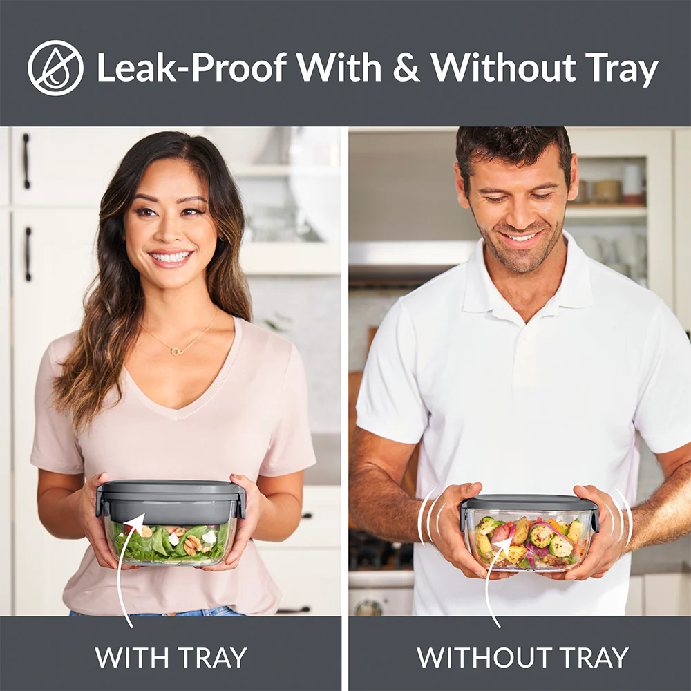 - LARGE, AIRTIGHT SALAD BOWL: Keep food fresh longer with this spacious 7.6 cup glass bowl to mix your salad ingredients. The unique silicone seal around the lid and locking clips prevent leaking when you use it without the tray.